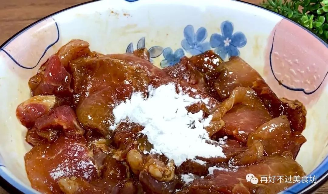 3、抓拌至黏糊后,再倒入半个鸡蛋清,再次抓拌均匀,抓匀后,加入一小勺干淀粉,继续抓拌均匀,最后放在一旁腌制十五分钟。