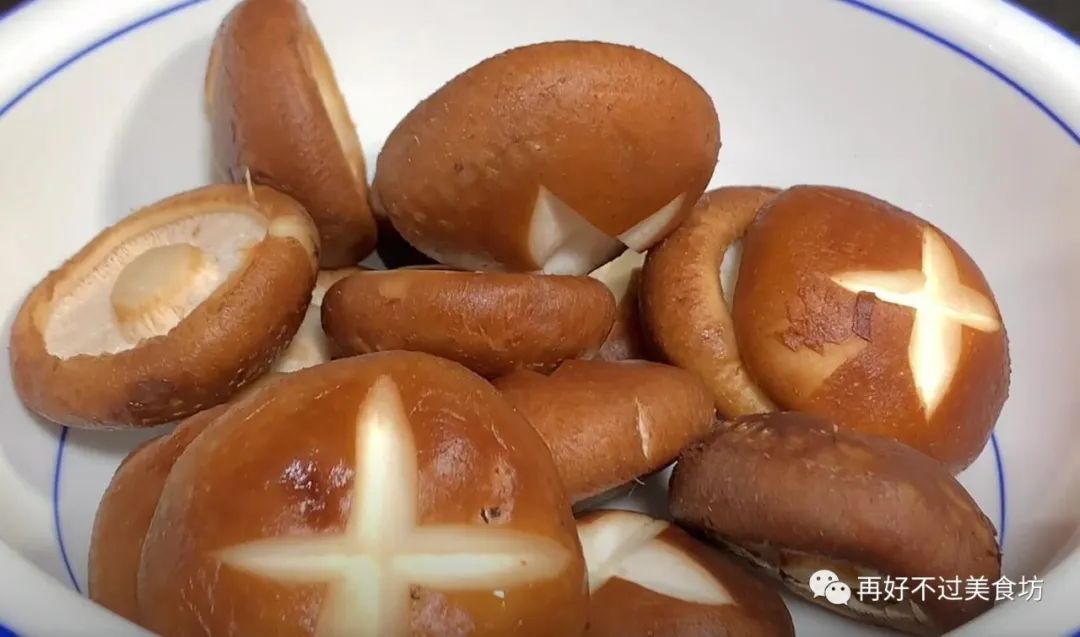 2、将洗干净的香菇放在案板上,然后给它打上十字花刀,全部切好以后,倒入大一点的碗中备用。