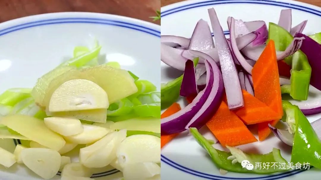 4、接下来准备几个大蒜,切成蒜片,一小块生姜切成片,半根小葱切成葱花,再准备半根胡萝卜、半根青辣椒切成菱形块,半个紫洋葱切成条,切好后装入盘中备用。