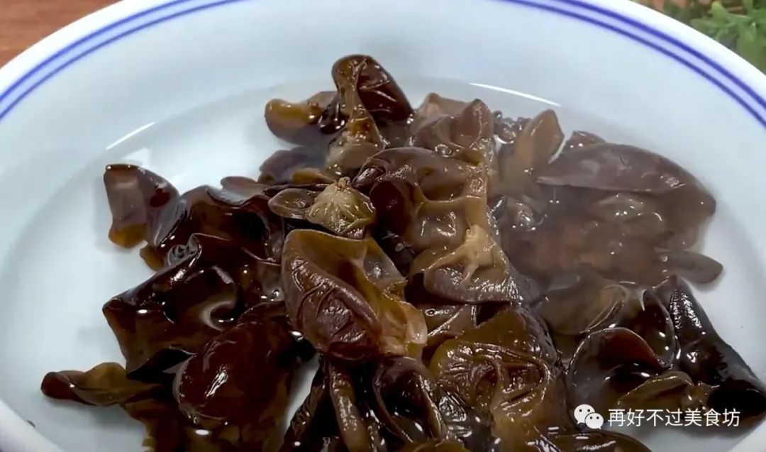 5、这时候,木耳已经泡发好了,泡好以后多清洗几遍,洗好后,控水捞出来,放入开水锅中焯烫,焯水的时间不用太长,一分钟左右即可,时间一到,就捞出来过凉备用。