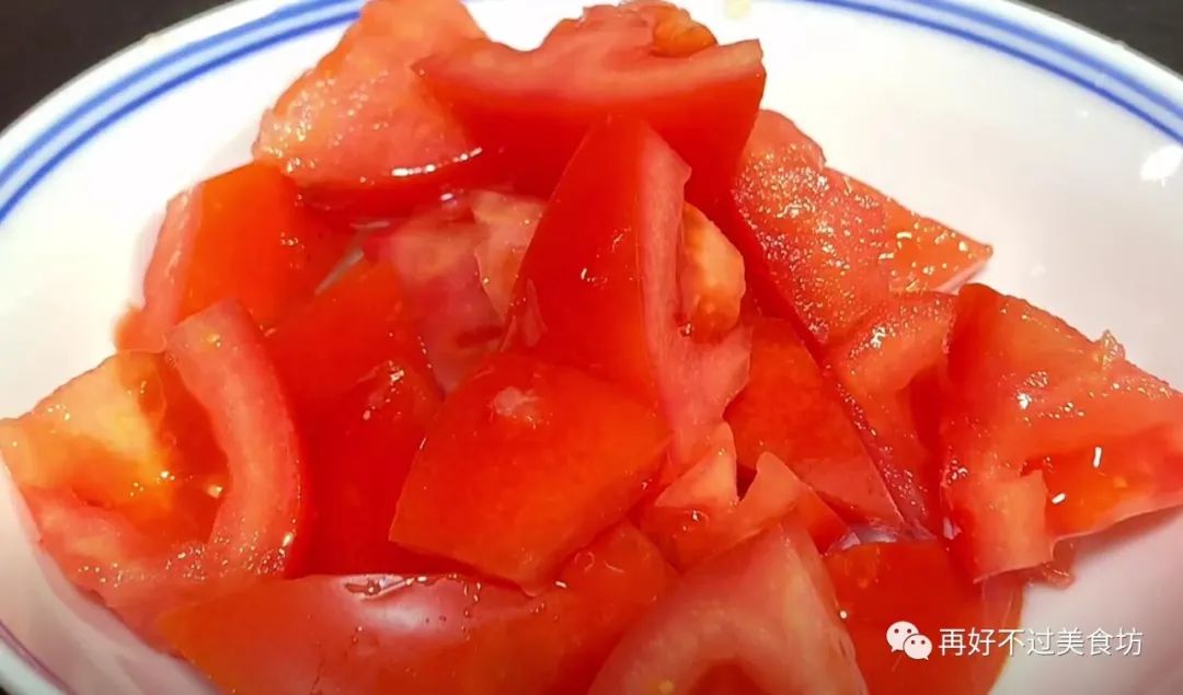 4、接下来准备一个西红柿,洗干净之后将它对半切开,再把里面的硬芯切掉,不然后给它切成滚刀块,切好后,倒入碗中备用。