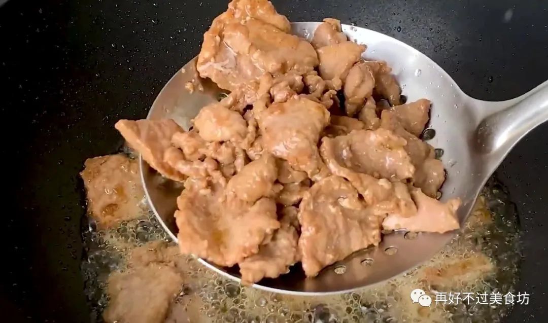 6、下面起锅烧油,油热后,倒入腌制好的肉片,然后快速滑散、滑熟,炒好后,先把它盛出来备用。