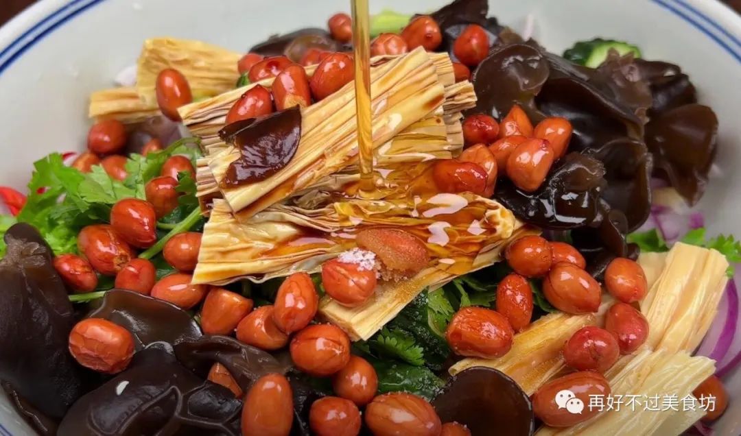 4、下一步放入刚切好的食材,还有煮熟的腐竹、木耳、花生米,调味的话,加一点盐、生抽、陈醋,再来几滴香油,用手把它揉拌均匀,就可以开吃了。