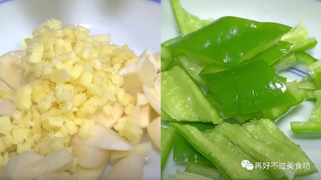 5、再准备几个大蒜,给它切成蒜粒,一块去了皮的生姜也把它切成姜末,再准备几个青椒,给它改刀切成菱形块,切好后,倒入碗中备用。
