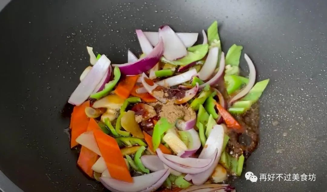 7、锅中留底油,倒入葱姜蒜炒香,炒香后,再倒入切好的配菜,把配菜炒至断生后,倒入一勺生抽,一点点蚝油,适量的老抽,加入一勺五香粉或者十三香。