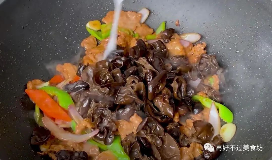 8、下一步再把肉片加进来,加入一勺食盐、一勺鸡精、一勺白糖,木耳也倒入锅中,想要木耳脆嫩入味,必须加入一勺水淀粉,给它勾个薄芡,开大火翻炒均匀。