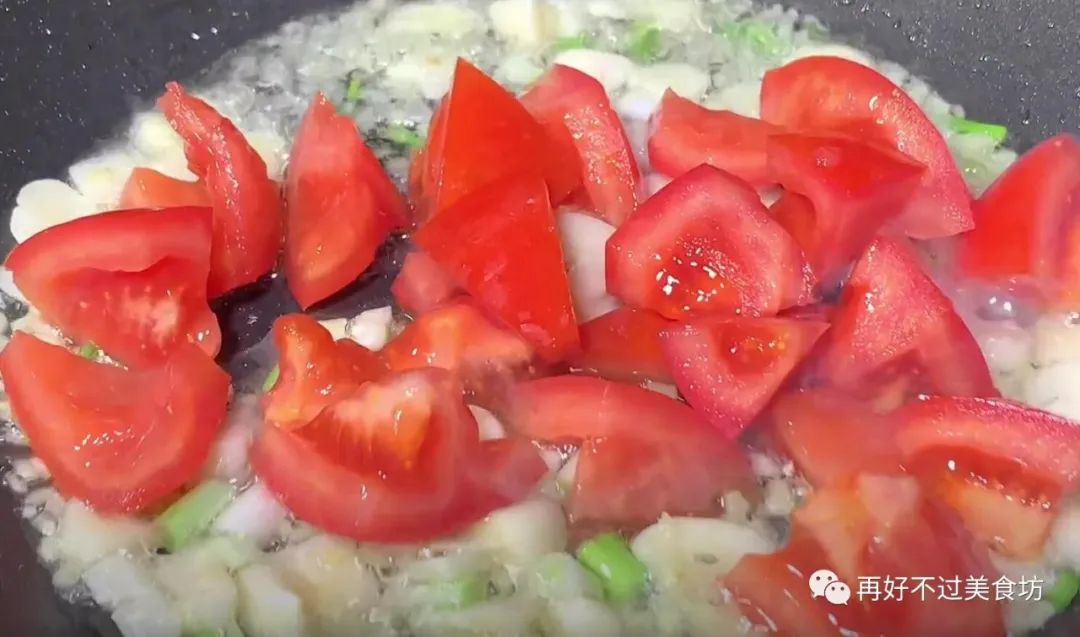8、重新起锅,加入少量的食用,油热后,把姜蒜末放入锅中,开大火快速地翻炒均匀,接着再把西红柿加进来,大概炒个二十秒,西红柿差不多就熟了。