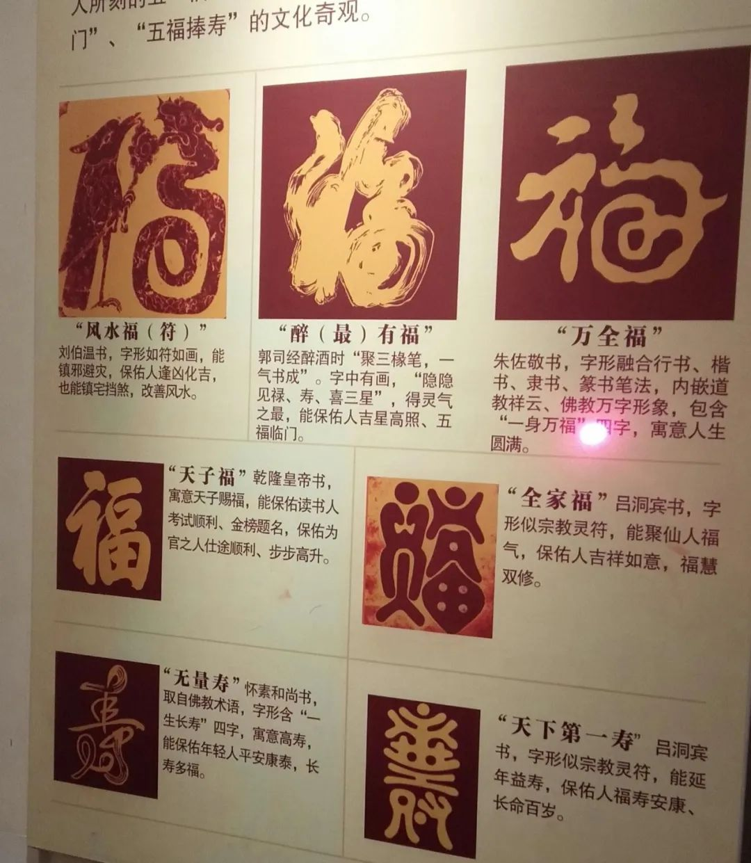 馆内展示的五福图,详细介绍了民间“五福捧寿”的含义、字形和来历。其中有“风水福(符)、醉(最)有福、万全福、天子福和全家福”,捧着“无量寿和天下第一寿”,这些“福”字、和“寿”字,都是独秀峰上的摩崖石雕,后经拓印保存下来的;