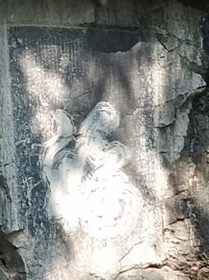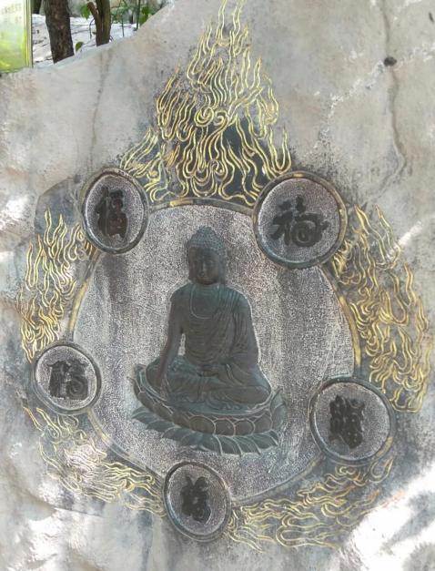 这是一块五福崖雕,“佛主居中坐,五福纷至来”,预示着这里是五福宝地。