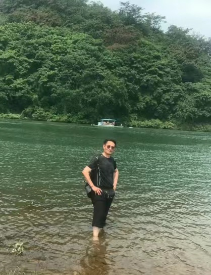 很快我们一行就出了古镇南头,到了刚才坐竹筏经过的“江中孤洲”,当然名字是我取的。 我对水情有独钟,看到江河湖海总会千方百计会下去,今天早有准备,穿了拖鞋,一上岛我就忙不迭地下到齐膝深的江里折腾了一番。其他人都各自忙着拗造型拍照。