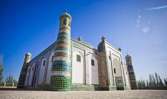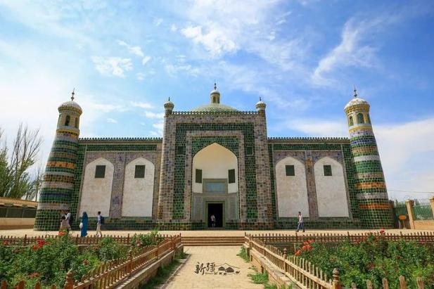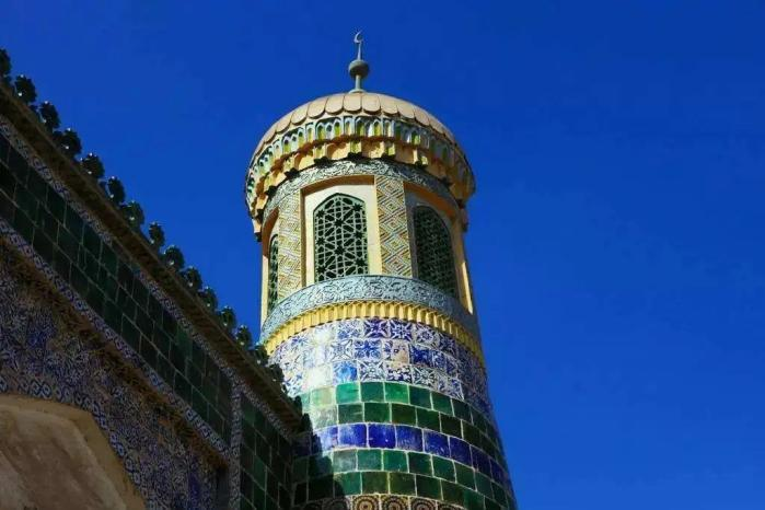 香妃墓就像一座富丽堂皇的宫殿,高40米,由门楼、小礼拜寺、大礼拜寺、教经堂和主墓室5 部分组成。建筑恢宏漂亮,又带有非常浓厚的伊斯兰教风格,非常精美别致。