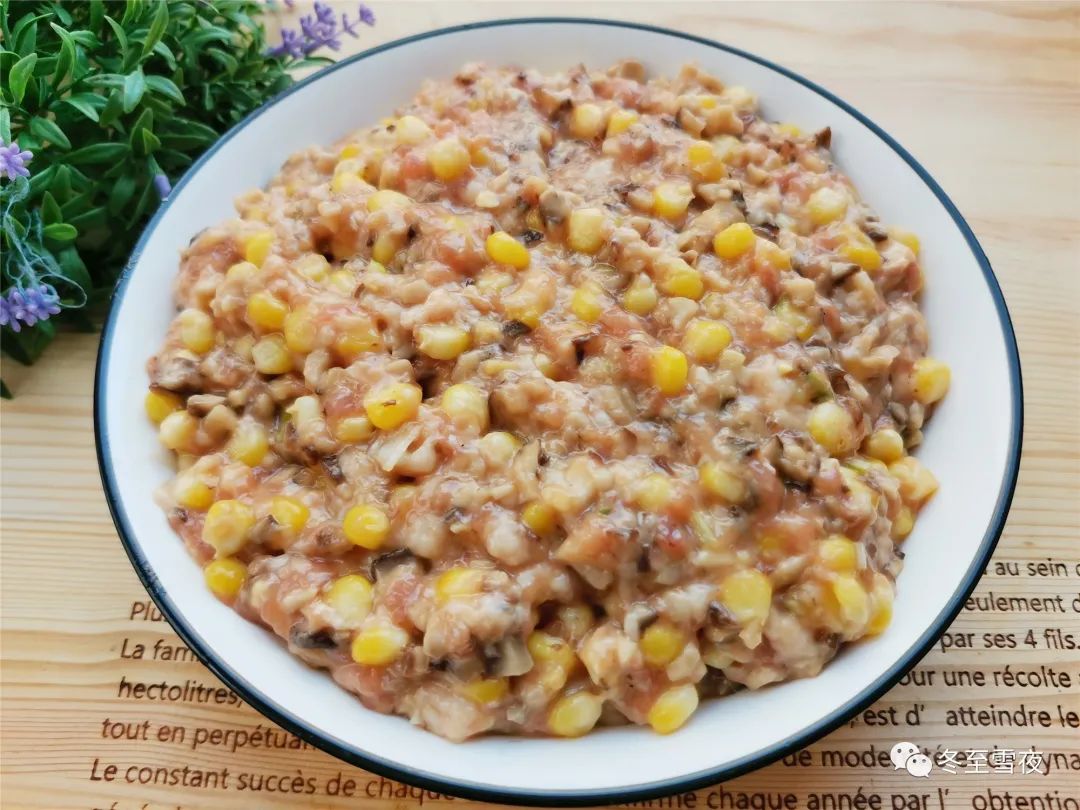 【玉米猪肉馅饺子】所需材料:猪前腿肉(前槽肉)1斤、玉米粒半斤、香菇半斤、鸡蛋1个、豆油3-4汤匙、盐适量、蚝油1汤匙、葱1段、姜1块、生抽1汤匙、老抽半汤匙、十三香半茶匙、白糖半汤匙、味精适量、花椒十几粒、大料1个、清水适量、