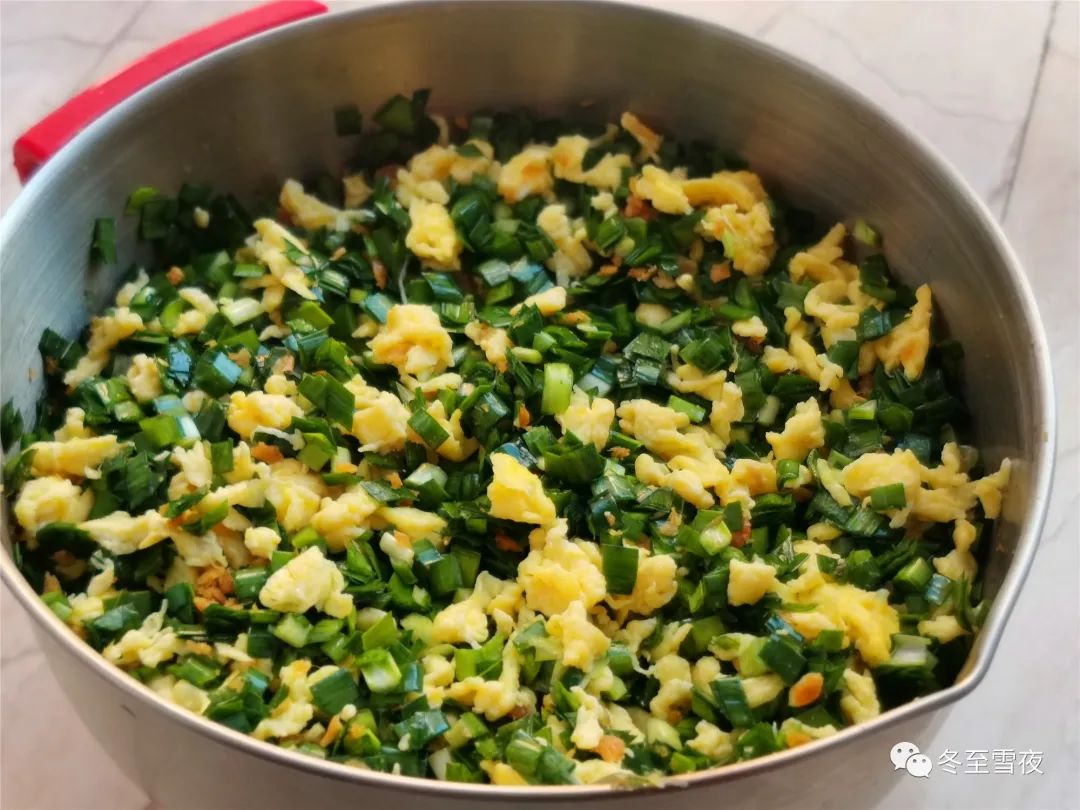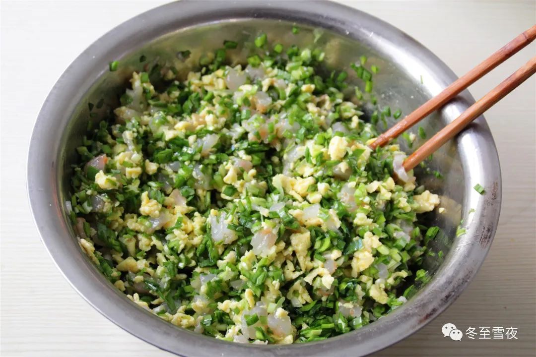 【韭菜鸡蛋馅饺子】所需材料:韭菜1.5斤、鸡蛋5个、虾皮适量、豆油、盐适量、