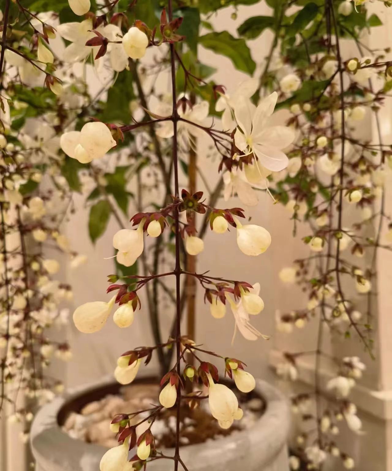 尤其是打开灯光的时候,看上去会更让人心动,叶片嫩绿,感觉特别的清新可爱。小花朵们纷纷的垂下来,一串串的看着那么可爱。