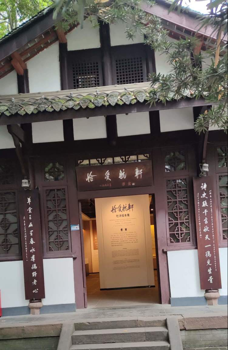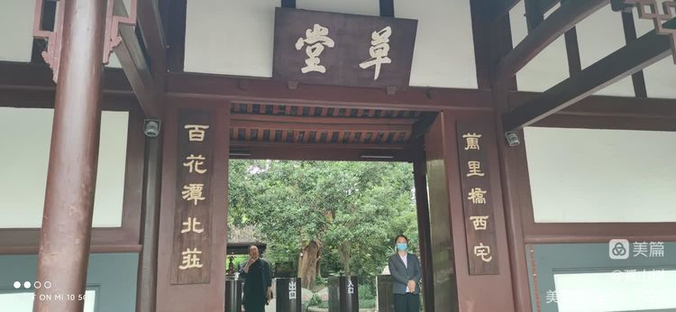 中轴线正门匾额“草堂”二字为康熙17子,果亲王允礼所题,门联:“万里桥西宅,百花潭北庄”。出自杜诗《怀锦水居止二首》,准确点明了当年草堂地理方位。