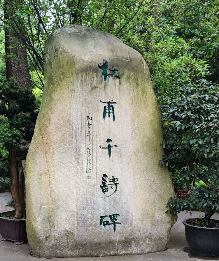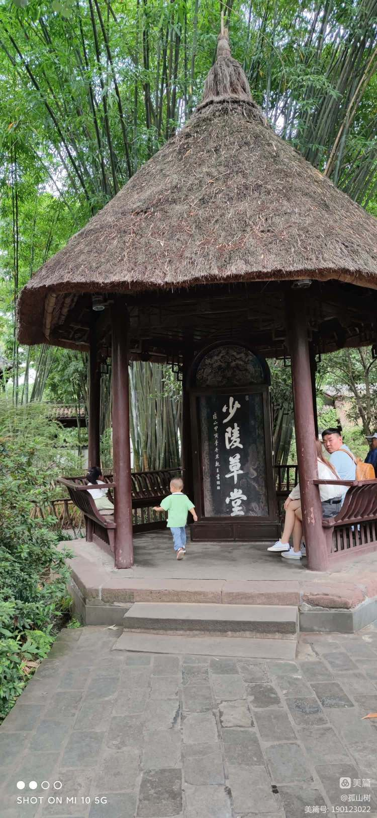 少陵碑亭,一座以茅草作顶的亭子,内有一石碑,镌刻“少陵草堂”四个大字,乃果亲王允礼送达赖喇嘛入藏,经过成都,特拜谒草堂,留下的手迹。