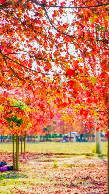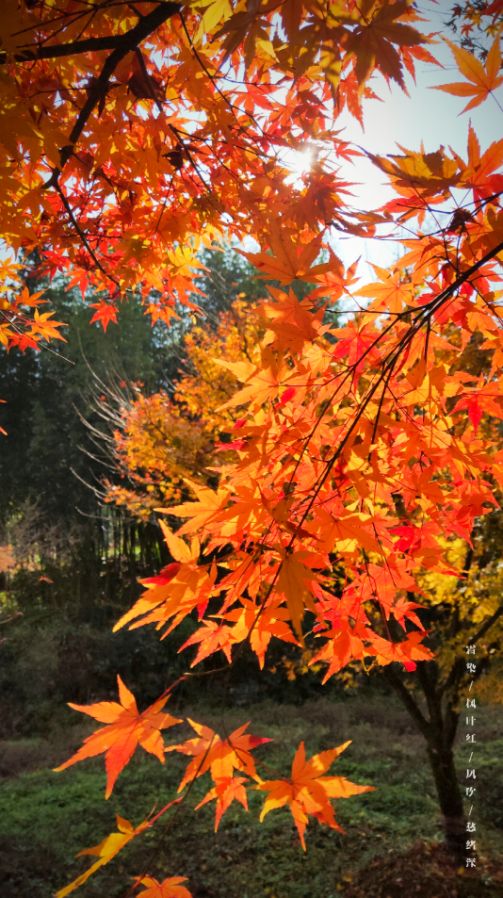 走在枫叶林下,看阳光透过枫叶的缝隙洒下斑驳的光影,秋色满溢,极具诗意。微风吹来,枫叶醉了,心也醉了!