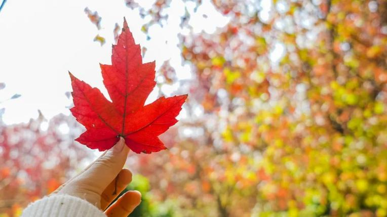 枫叶叶片多像羽毛般秀巧且轻盈,蓝天白云下的红枫林,红枫簌簌,宛如一幅秋日油画。