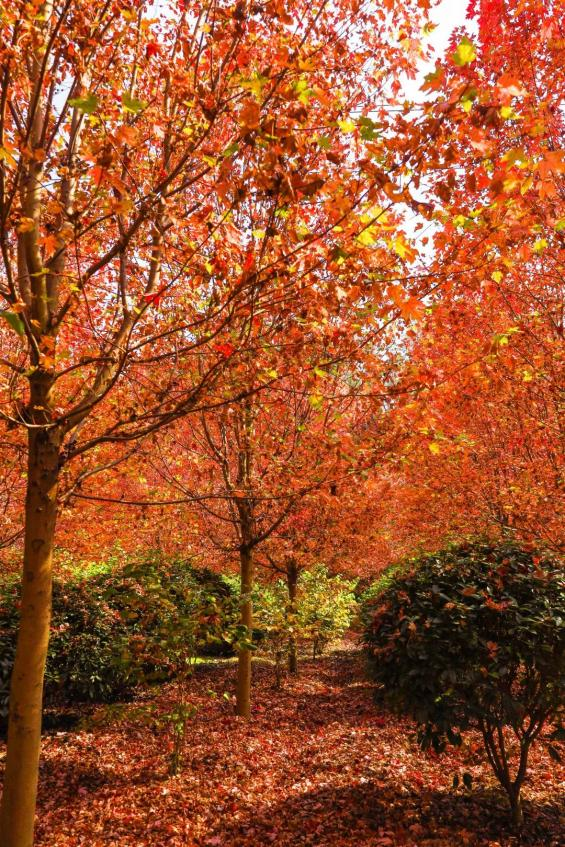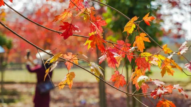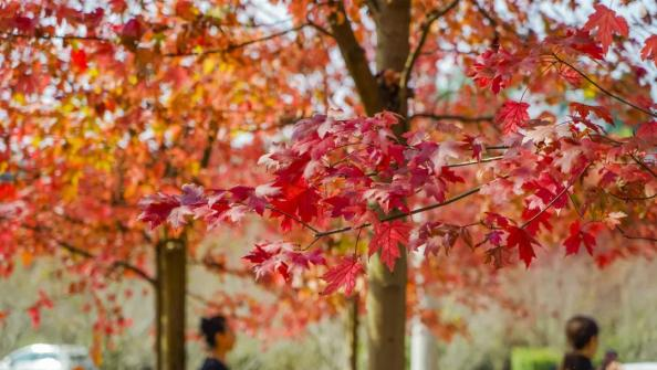道路两旁的红枫,在暖阳的映衬下,毫不遮掩地展示自己的色彩,有的红得绚烂夺目,有的被旁边绿植映衬出灿灿的金黄,别有一番秋日风情。