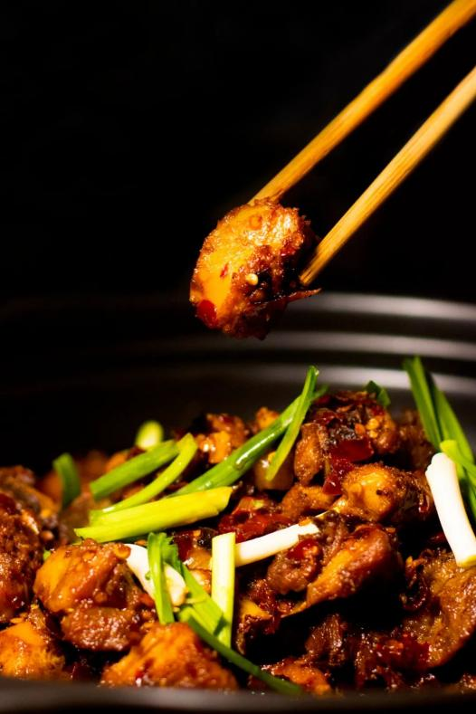 鸡肉被恰到好处的火候炒得糯叽叽,同时充分吸收了辣椒和香料的香辣味,香、辣、糯层层叠叠,滋味完全融合。