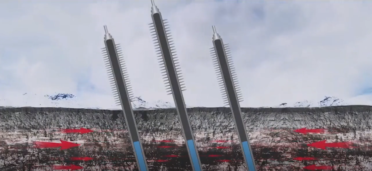它们等间距插入地下,在寒冷时会通入热水或蒸汽,融化冻土防止地基抬升。