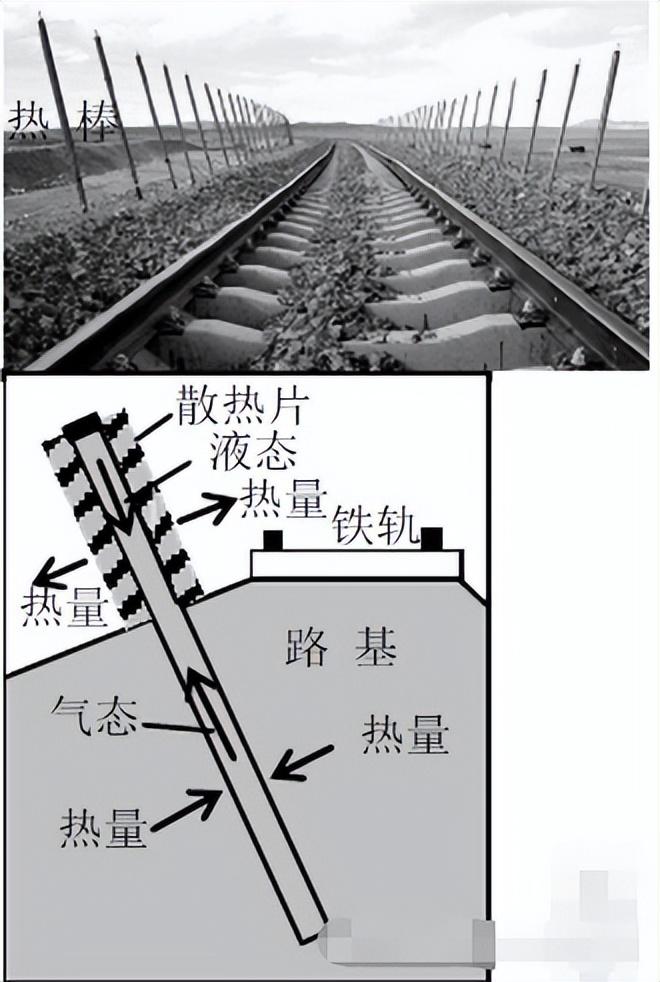 这些铁棒被称为“热棒”,长约2米,深插在路基下5米深的地底。