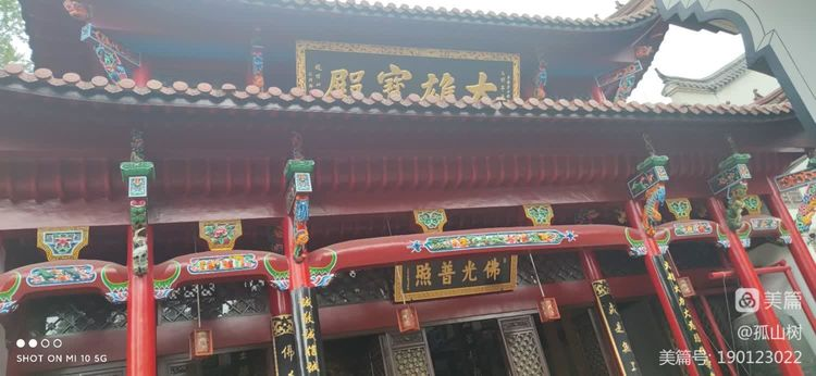 化城寺山门,匾额为赵朴初书写。两边红底金字的匾额,左首是1705年康熙皇帝赐九华山御书《九华圣境》,右为1766年乾隆皇帝赐九华山御书《芬陁(陀)普教》,皆为仿制。