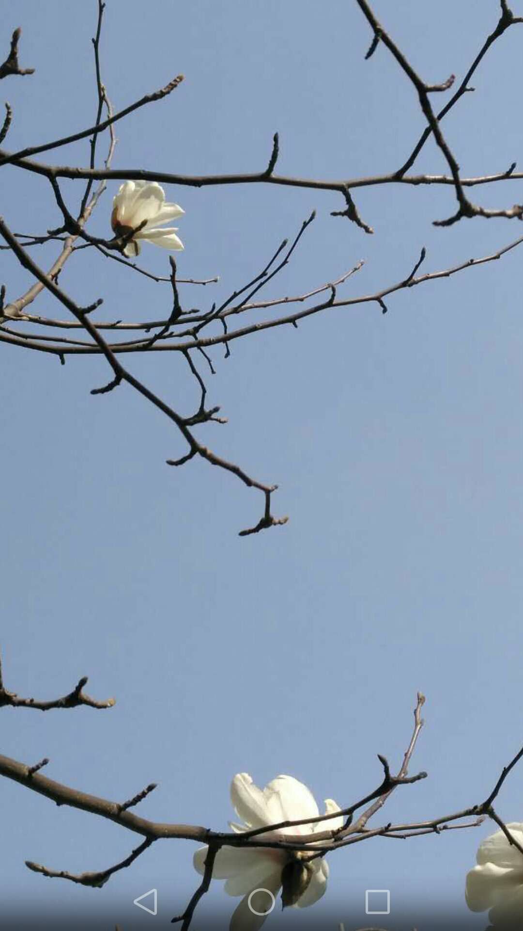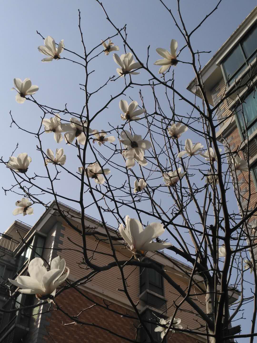 初六,早上朋友发来了微信:隔山,隔水,不隔音。封城,封路,不封情。朋友告诉我,她参加了腾讯公益,积小善,成大爱,捐款给湖北红十字会的活动。中午,我看到家门口的这棵白玉兰树时,不由得“啊”了一声,树上又开了几朵白玉兰花哟,那白的温润的花瓣朵朵向上,在寒风中傲然盛开。