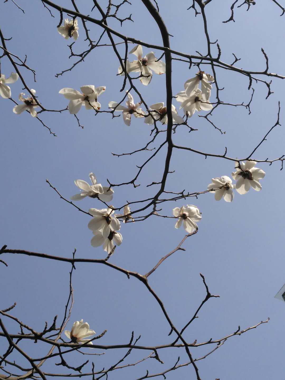 正月初三,我去看这棵白玉兰树。哇,居然开了几朵白玉兰花,虽然是孤零零的几朵白玉兰花,可颜色却晶莹剔透,晶莹夺目,这是“寒凝大地发春华”啊。