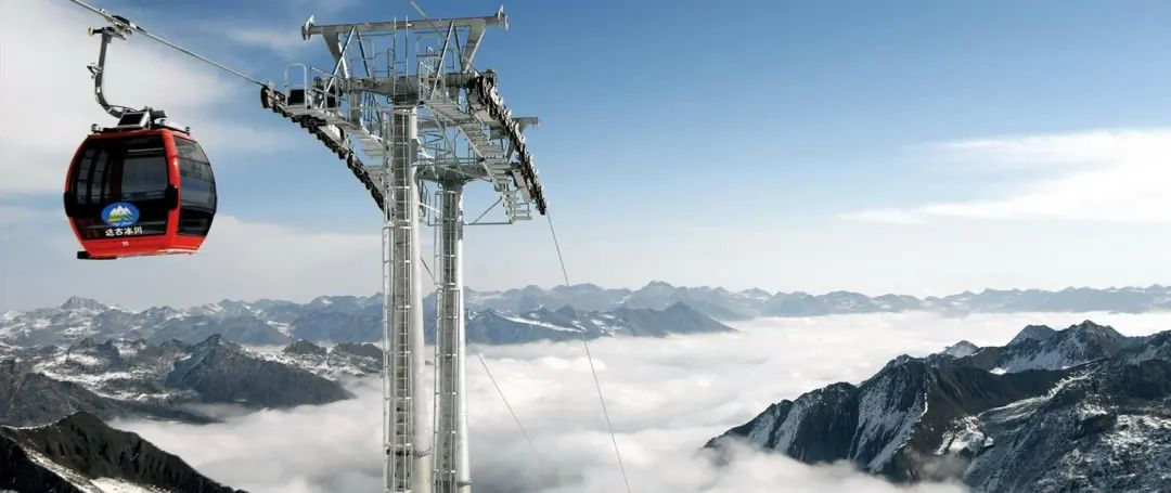 乘坐缆车到达达古冰川的峰顶, 能看到大雪覆盖了栈道,四周全是白茫茫的雪。