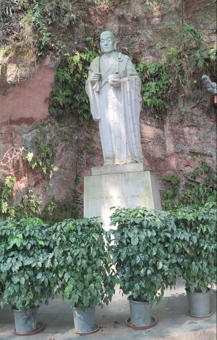 导游讲,海通禅师开凿大佛顺利进行时,当地恶霸插手,欲夺其工程。大师不服,恶霸扬言要剜去他的双眼,海通坚定说:“宁失去双眼我也要将大佛建成”。