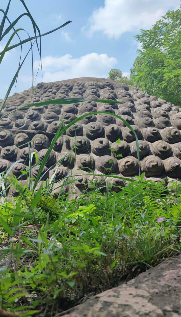 大佛顶上共有螺髻1051个,1962年维修时清点的。远看发髻与头部浑然一体,实则每个石块是单独嵌就,无沙浆粘接。头部共18层螺髻中,有三道排水沟,用锤灰垒砌修饰而成,远望看不出来。古人在防水固石方面下了很大的功夫。