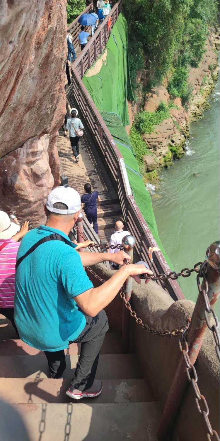 依崖而建的栈道,近期建成。铁索链扶手,仅容一人通行。虽导游劝诫,全团33人中有21人下到了大佛脚趾处。说是500米,人多路窄,行动缓慢,排队紧密,难容穿插。要经过几次辗转徘徊,控制住人流,终达栈道,隧洞,秩序好多了。