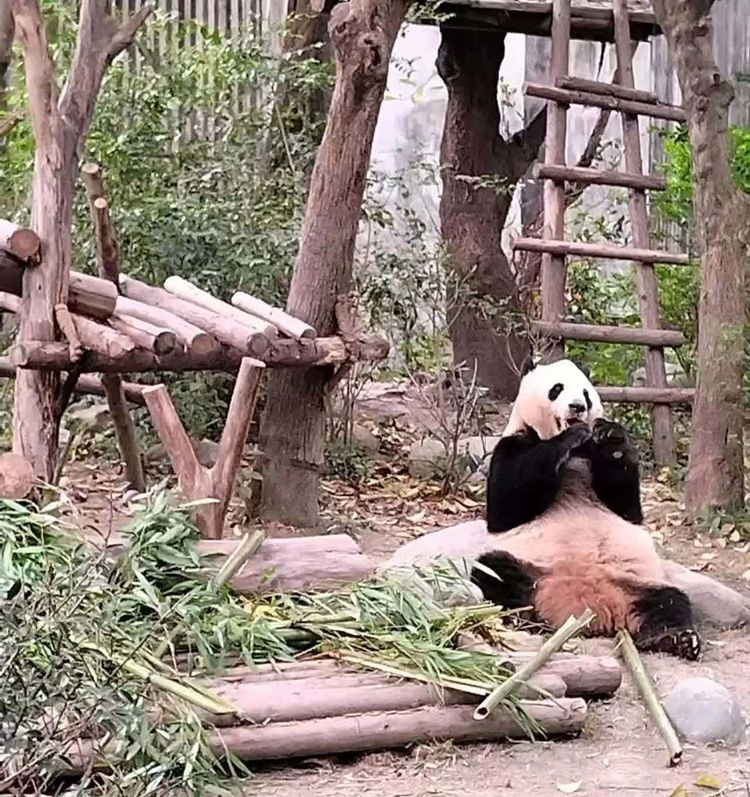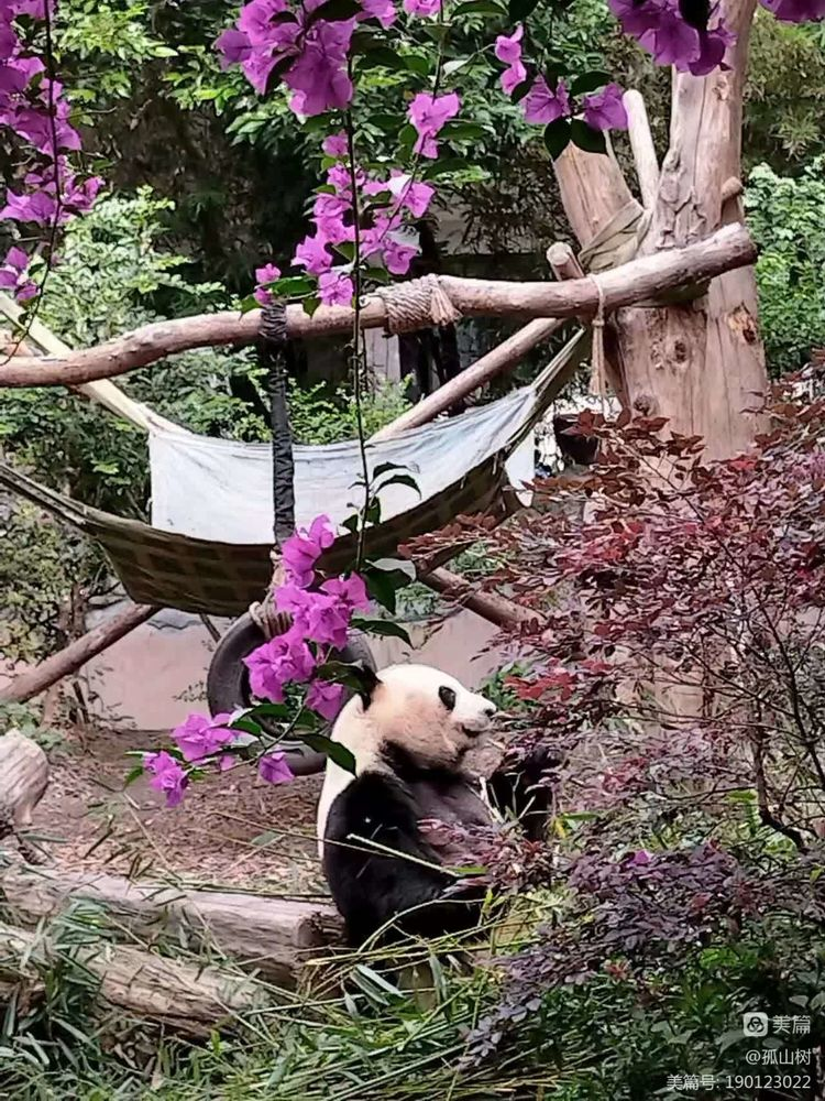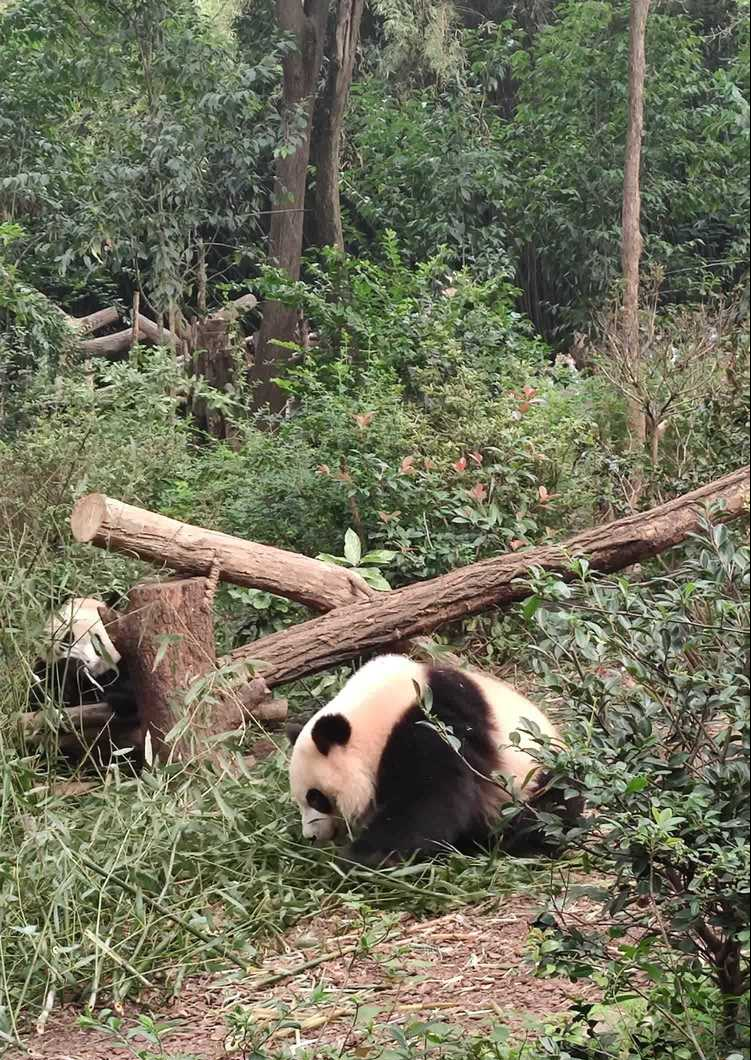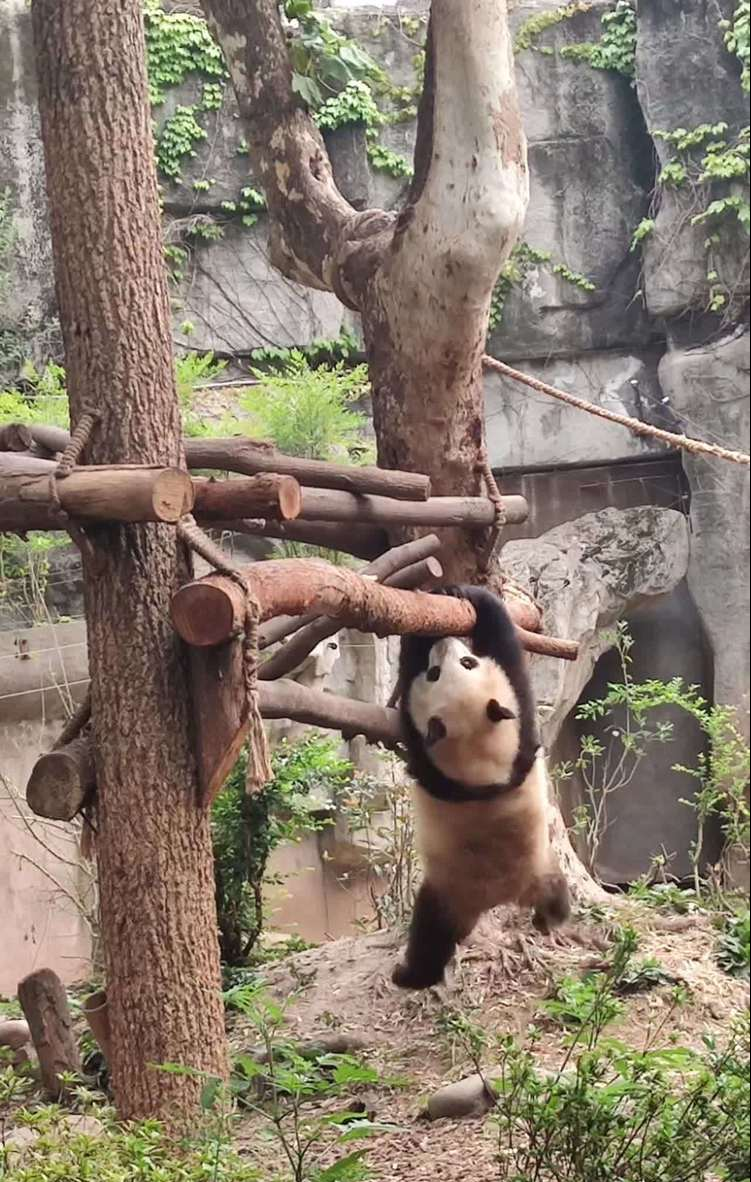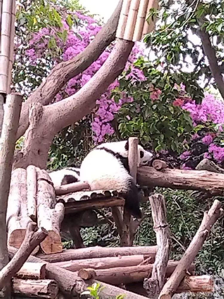 这只是勤快的,摽在树干上,打秋千,做健身呢!还有的躺在草地上,啃竹子。悠然自得,活得惬意,全然不理会在樊笼之内。