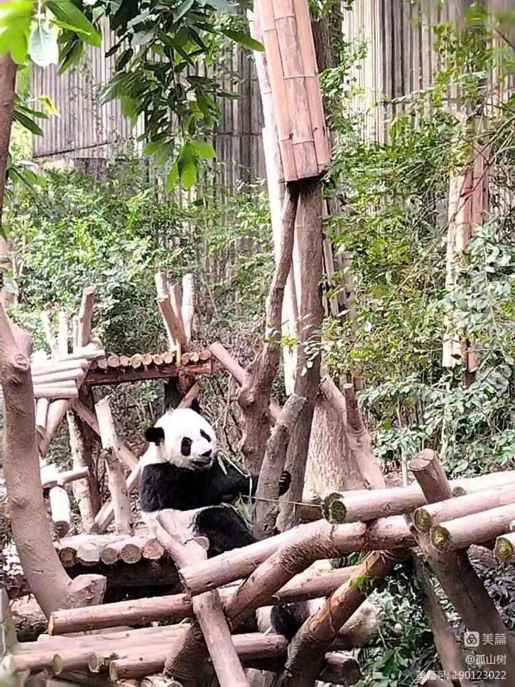 这里的大熊猫多是中青年,生活在模仿大自然生存的环境中。一座小山,游客排长队在周边环行平台上搜寻熊猫倩影,绿树婆娑,枝繁叶茂,熊猫胆小,藏于枝桠间,不努力寻找,挺难发现。这是熊猫产房,怀孕待产,备受优待。