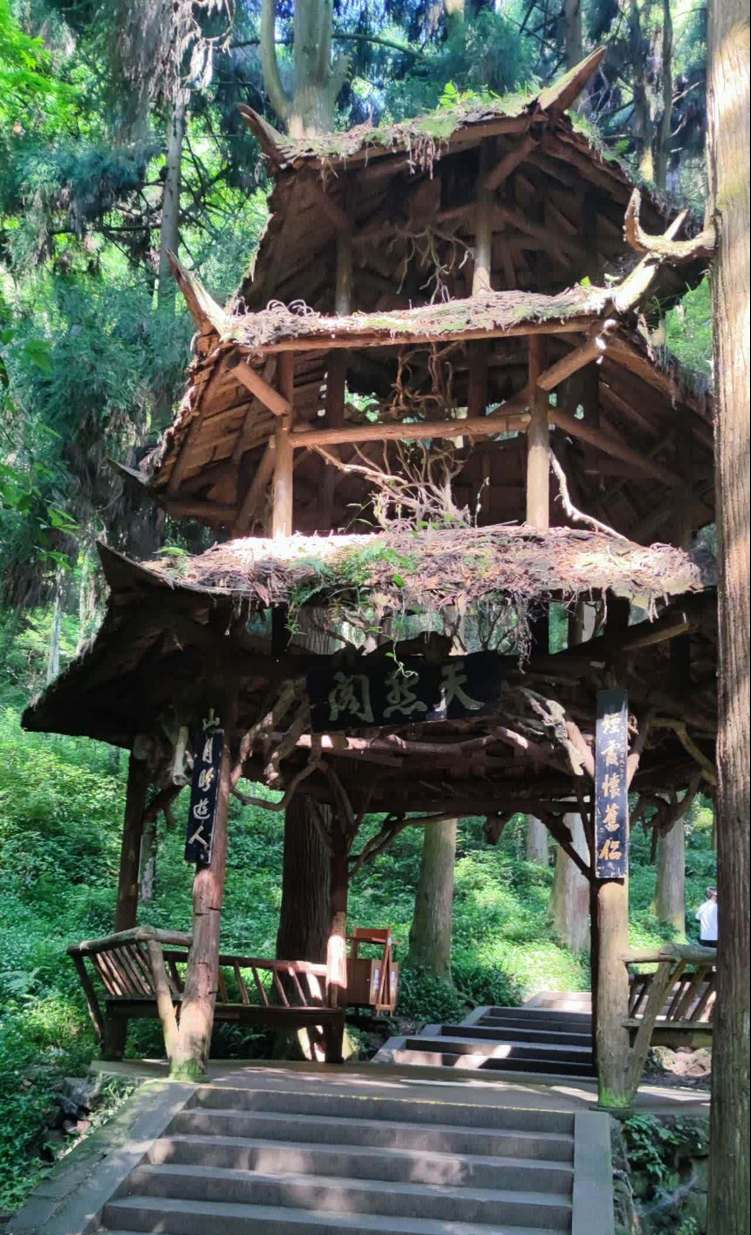 天然阁,三层八角的骑檐亭阁,以原木留节带皮为柱,老木为依,生树架构,枝藤缠绕,树根为凳,随势造型。高度融汇了道教:“天人合一”,“道法自然”,“三生万物”的思想。