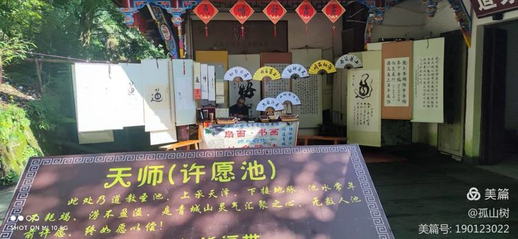天师许愿池,一弘池水,很清徹。池不大,也不深,据说积年累月,不溢不涸。池内撒着香客扔得纸币和钢镚。池旁有先生在写字出售,书画,扇面等文化品。