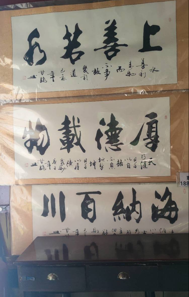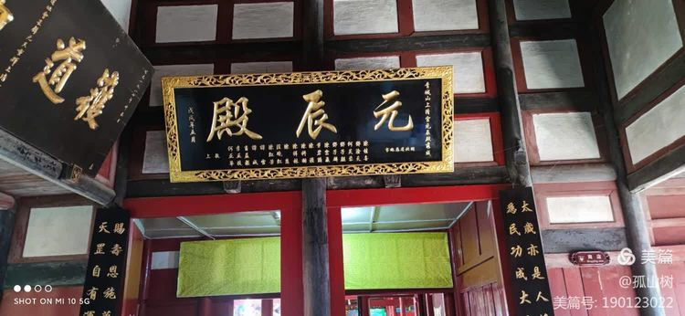 右走过一天井,廊下摆放着条幅,苍劲有力,“道”,“和”,“上善若水”,“厚德载物”,“海纳百川”等格言。室内有历代名人雅士的大量诗词、书画、匾额、楹联等珍品,具有很高的艺术价值,有道教博物馆之称。