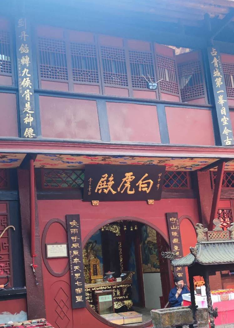 乘缆车(60元),载8人,10分钟可达上清宫,即游览线路尽头,青城山顶峰了。其道观晋朝时所建,含有老君殿、三清大殿、文武殿等,保留了许多古建筑和古文物。