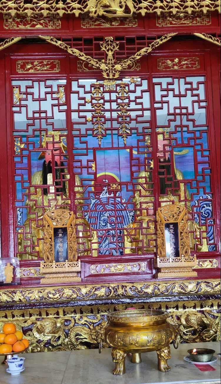 东华殿,长五间,中祀东华帝君,左龛祀是吕洞宾,牌位“吕纯圆明宫阳。右龛呢,写着“洞天飞行救劫天尊”,不大明白,后来一查,是钟离权祖师。