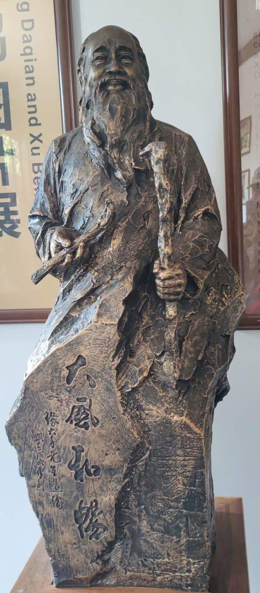 太上老君造像,以徐悲鸿当年青城遗作《紫气东来》为蓝本,参考各家大师之特色创作。老君像13.6米,连牛身通高16米,钢筋水泥浇铸,精铜包里,金光炫目,栩栩如生。