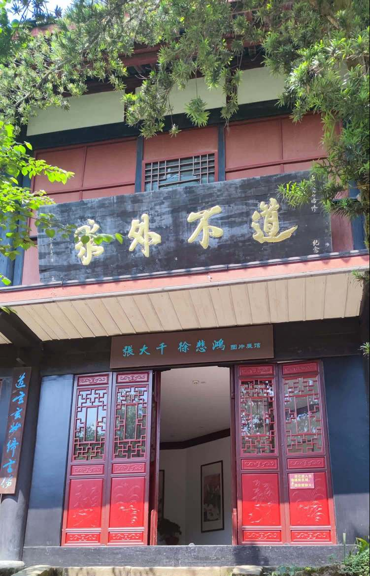 下山另一条道,意外走到张大千、徐悲鸿画作纪念馆。张大千先生1938年为避日寇侵略,举家在此居住数年。当年居住画室,现为展厅。张大千先生给张三丰,王母,麻姑,花蕊夫人,张天师等青城人物画像刻碑。1941年又率弟子去敦煌临摹壁画达一、两年之久,之后再返青城山,抗战胜利后离去。