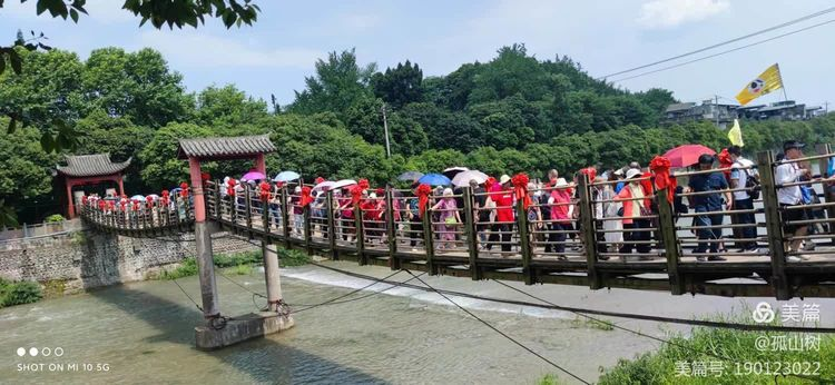 要走过安澜索桥,铁索上铺垫木板,左右晃动,游客川流不息,人很多。