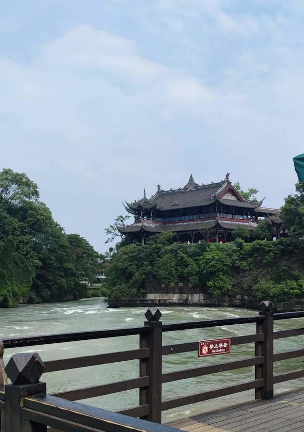 台阶甚高,攀登吃力。后殿有下行暗道,好奇心驱使,一窥究竟。原来可通江边,堤岸上有一凉亭,对岸石砌大字“宝瓶口”。原来就是岷江分流的宝瓶口干渠,供川西四十余县,一千多万亩良田灌溉。