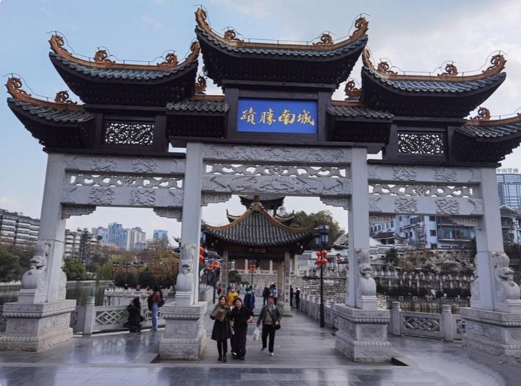 甲秀楼石牌坊在清朝时为全木质结构,上书“城南胜迹”四个大字,通往甲秀楼的这座“浮玉桥”的名字来源于其质地,由贵州特产白棉石打造,从远处看如一条玉带浮在水面。