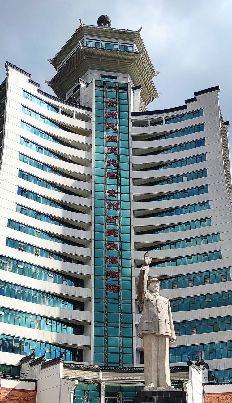 前弧形面有机衬托毛主席塑像,大楼六个面的每一面形状都构成“山”字形,建筑造型着力强调贵州、民族、文化三个内涵,颇具地域及民族色彩。