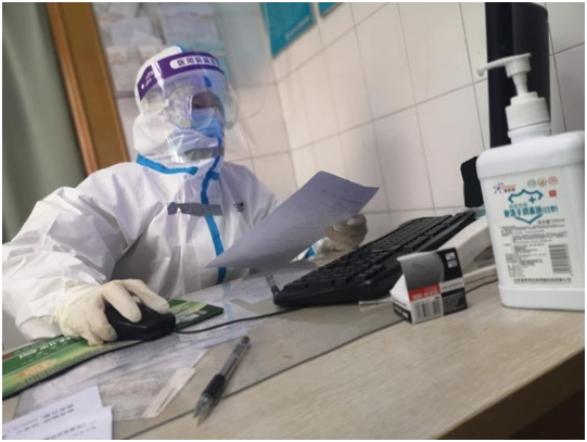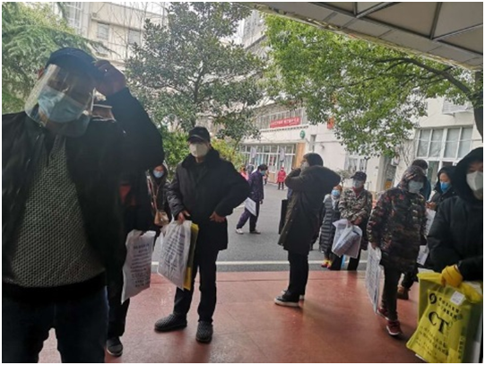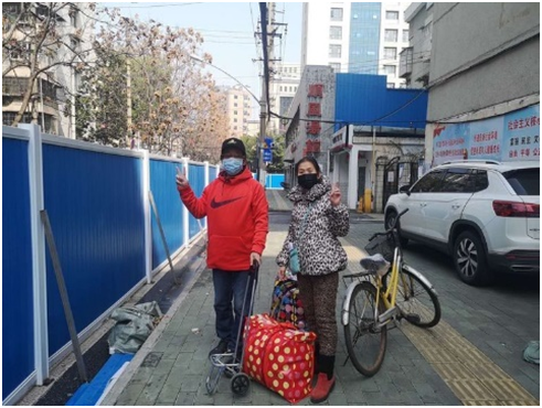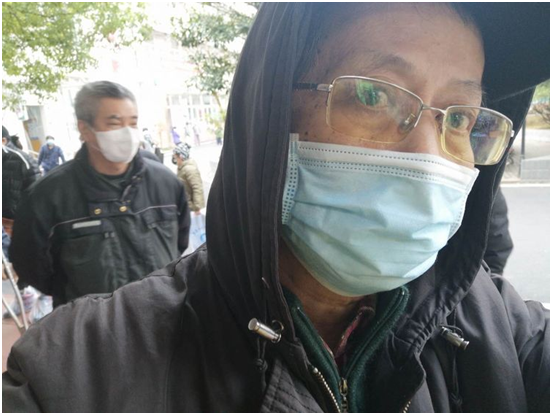 正月初四(1月30日)老伴王新去了一趟超市购物,也按要求戴了口罩、手套,在超市限制人流分批进入的情况下还是中招了。2月10日发现低烧,当时以为是感冒,但吃感冒药后第二天低烧不退,去了市六医院检查CT、核酸,确定是新冠肺炎症状,宅家等了三天,2月15日才有床位,由社区安排到市一医院住院,我推着自行车送王新到台北路集合地点,临别时拍下一张照片,我无法预料她还能不能回家,因为好多患者一去就不复返了……