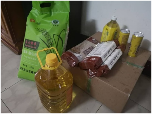 回家后社区给我及时送来米、面、油、蔬菜慰问。