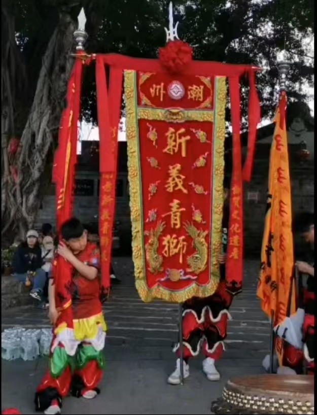 潮汕舞狮中最著名的当属青狮,这个舞狮团的队旗正是“潮州新義青狮”。青狮,俗称“青狮白目眉”,也称“开口狮”。这种狮舞形式在潮汕地区具有显著的地域特色,青狮的外观特征是前额突出、鼻孔高大、眼似铜铃、长须鬈发,给人一种狰狞威猛的感觉。在潮汕民间,只要是神诞、祭奠、节庆、开业、进宅、迎神、奠基和赛会等庆典,都有舞青狮的习俗,祈求国泰民安、风调雨顺、万事如意。