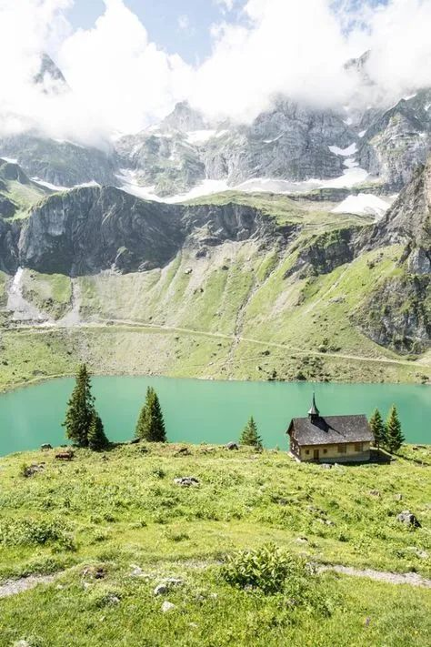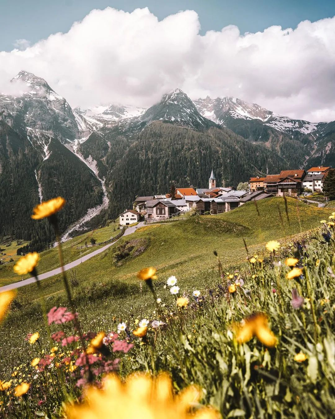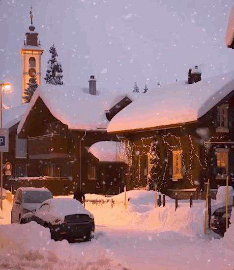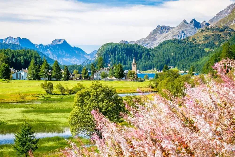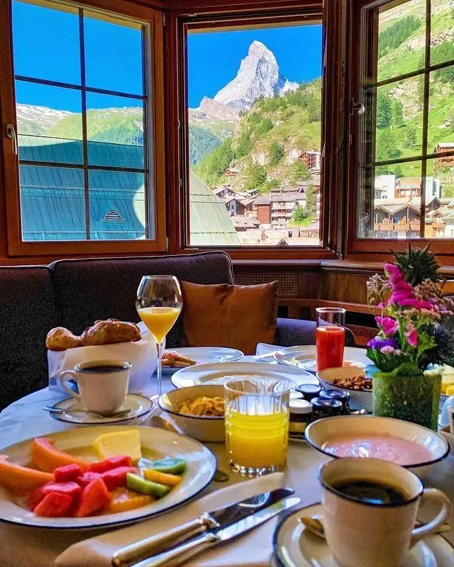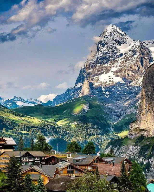 山顶飘雪山腰却牛群散步、青草翠绿,